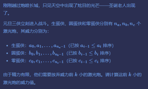 对于两个序列的问题,需要找到第 \(k\) 小,则在两个序列找到第 \(k/2\) 小,舍去小的那一部分 \(k/2\),这样实现了二分。三个序列取 \(k/3\) 即可。