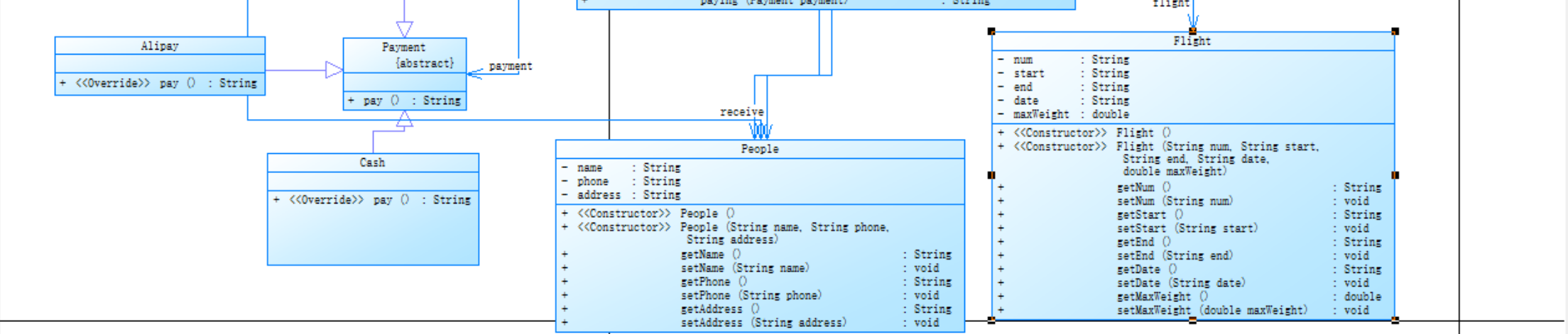 - 第二次航空货运管理系统我还遇见了不知该如何运用依赖倒转原则的问题,后来在对类图的分析中确定了Control 类依赖于抽象的 Payment 类,而不是具体的支付方式类(Wechat、Alipay、Cash)。在 Control 类中,使用 Payment 类型的引用作为成员变量可以根据需要传入不同的支付方式对象,符合依赖倒转原则。