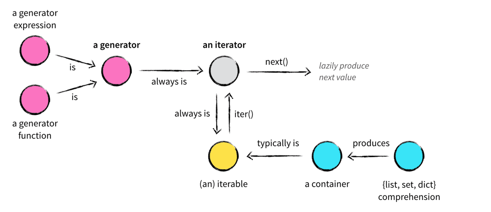 Python的数据结构容器(container)、可迭代对象(iterable)、迭代器(iterator)、生成器 (generator)、列表/集合/字典推导式(list,set,dict comprehension)之间的关系图