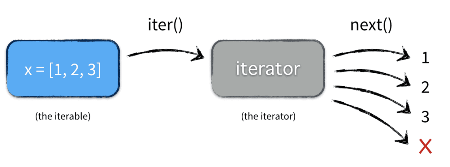那么什么迭代器呢?它是一个带状态的对象,他能在你调用 next() 方法的时候返回容器中的下一个值,任何实现了 __next__() 方法的对象都是迭代器,至于它是如何实现的这并不重要。