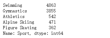 #查看各个项目小于18岁的人数 data[data.Age<18].Sport.value_counts()[:5]