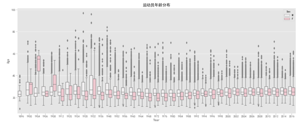 通过上面的箱型图可以看出,在这120年中的运动员选手的年龄大致都分布在17岁--30岁之间,整个跨度很大,从10岁到97岁的都有,大致是呈正态分布。从时间上看,*几十年运动员的年龄趋向于*稳,并且女性运动员的年龄比男性运动员年龄略低。