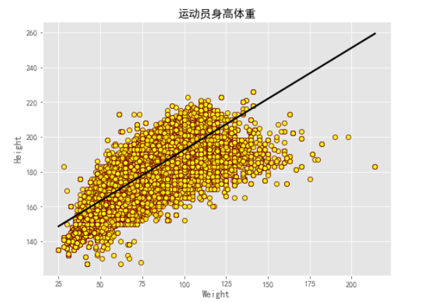 #奥运选手身高体重 WeightHeight_data = data.dropna(subset=['Weight','Height']) plt.figure(figsize=(8,6)) sns.regplot('Weight','Height',data=WeightHeight_data, scatter_kws={'facecolor':'yellow','edgecolor':'maroon'}, line_kws={'color':'k'}) plt.title('运动员身高体重') plt.show()