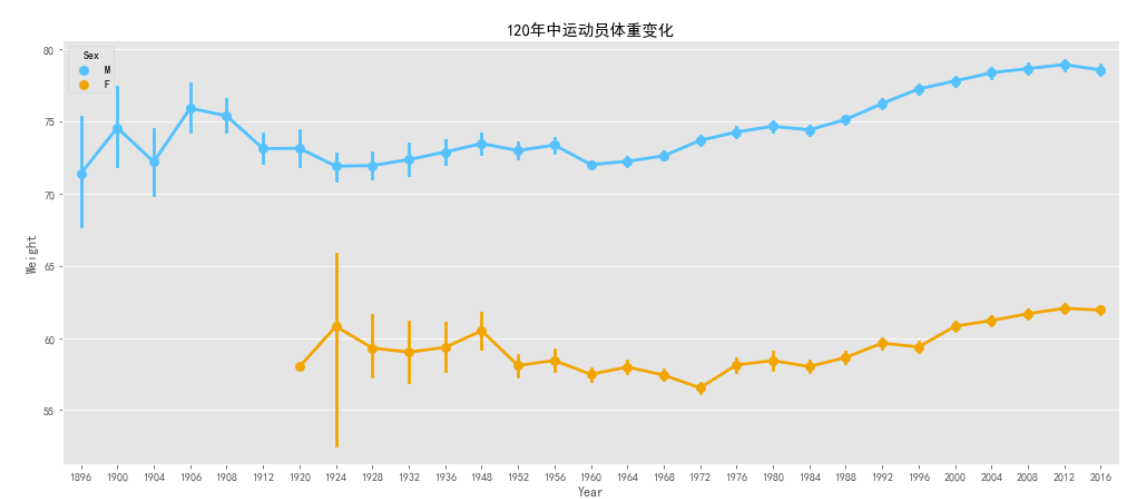 在对运动员体重进行可视化中,可以明显看出男性运动员的体重比女性运动员重。而且随着时间的推移,发现运动员的体重在逐渐升高然后趋*于*稳。