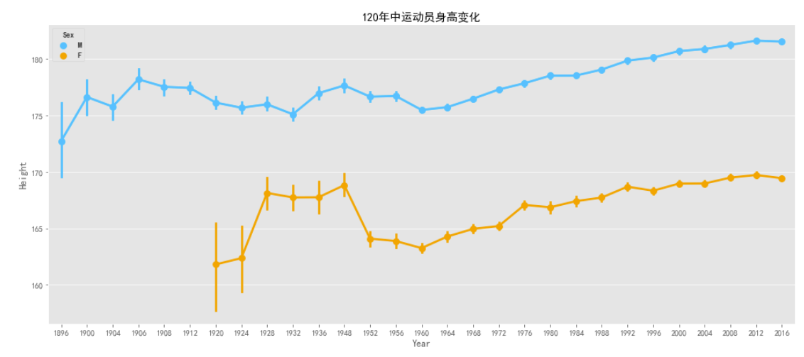 #查看这些年运动员的身高变化 plt.figure(figsize=(17,7)) tmp2 = data[data.Season=='Summer'] sns.pointplot('Year','Height',data=tmp2,hue='Sex',palette=sns.set_palette(['deepskyblue','orange'])) plt.title('120年中运动员身高变化')