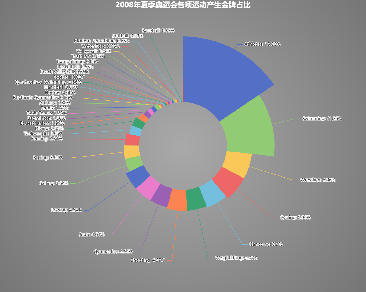 2008年奥运会在我国北京举行,所以我分析了2008年夏季奥运会各项运动产生金牌的占比。由图可知,田径项目占比较大排在首位,其次是游泳类项目。