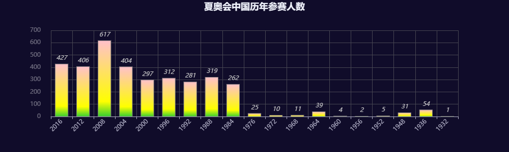 #中国历届奥运会参赛人数 #夏奥会的中国参赛人数 CN_data = data[data.region == 'China'] CN_data.head() athlete = CN_data.groupby(['Year', 'Season'])['Name'].nunique().reset_index() athlete.columns = ['Year', 'Season', 'Nums'] athlete = athlete.sort_values(by="Year", ascending=False) summer_bar = ( Bar(init_opts=opts.InitOpts(theme='dark', width='1000px', height='300px')) .add_xaxis([row['Year'] for _, row in athlete[athlete.Season == 'Summer'].iterrows()]) .add_yaxis("参赛人数", [row['Nums'] for _, row in athlete[athlete.Season == 'Summer'].iterrows()], category_gap='40%', itemstyle_opts=opts.ItemStyleOpts( border_color='grey', color=JsCode("""new echarts.graphic.LinearGradient(0, 0, 0, 1, [{ offset: 1, color: 'limegreen' }, { offset: 0.8, color: 'yellow' },{ offset: 0, color: 'pink' }])"""))) .set_series_opts(label_opts=opts.LabelOpts(is_show=True, position='top', font_style='italic')) .set_global_opts( title_opts=opts.TitleOpts(title="夏奥会中国历年参赛人数", pos_left='center'), xaxis_opts=opts.AxisOpts(axislabel_opts=opts.LabelOpts(rotate=45)), legend_opts=opts.LegendOpts(is_show=False), yaxis_opts=opts.AxisOpts(axislabel_opts=opts.LabelOpts(margin=20, color="#ffffff65")), graphic_opts=[ opts.GraphicImage( graphic_item=opts.GraphicItem( right=0, top=0, z=-10, bounding="raw", origin=[75, 75] ), graphic_imagestyle_opts=opts.GraphicImageStyleOpts( width=1000, height=600, ), ) ], ) ) page = ( Page() .add(summer_bar, ) ) page.render_notebook()