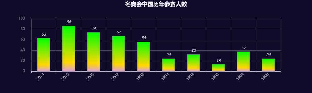 #冬奥会的中国参赛人数 winter_bar = ( Bar(init_opts=opts.InitOpts(theme='dark', width='1000px', height='300px')) .add_xaxis([row['Year'] for _, row in athlete[athlete.Season == 'Winter'].iterrows()]) .add_yaxis("参赛人数", [row['Nums'] for _, row in athlete[athlete.Season == 'Winter'].iterrows()], category_gap='50%', itemstyle_opts=opts.ItemStyleOpts( border_color='grey', color=JsCode("""new echarts.graphic.LinearGradient(0, 0, 0, 1, [{ offset: 1, color: 'plum' }, { offset: 0.8, color: 'gold' }, { offset: 0, color: 'lime' }])"""))) .set_series_opts(label_opts=opts.LabelOpts(is_show=True, position='top', font_style='italic')) .set_global_opts( title_opts=opts.TitleOpts(title="冬奥会中国历年参赛人数", pos_left='center'), xaxis_opts=opts.AxisOpts(axislabel_opts=opts.LabelOpts(rotate=45)), legend_opts=opts.LegendOpts(is_show=False), yaxis_opts=opts.AxisOpts(axislabel_opts=opts.LabelOpts(margin=20, color="#ffffff65")), graphic_opts=[ opts.GraphicImage( graphic_item=opts.GraphicItem( id_="logo", right=0, top=-300, z=-10, bounding="raw", origin=[75, 75] ), graphic_imagestyle_opts=opts.GraphicImageStyleOpts( width=1000, height=600, ), ) ], ) ) page = ( Page() .add(winter_bar, ) ) page.render_notebook()