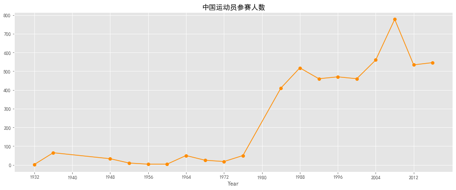 #中国参赛人数的变化 china=data[data.region=='China'] tmp = china[china.Season=='Summer'].groupby('Year')['ID'].count() plt.figure(figsize=(16,6)) plt.xticks(np.arange(1892,2020,8)) tmp.plot(style="-o",color='darkorange') plt.title("中国运动员参赛人数") plt.show()