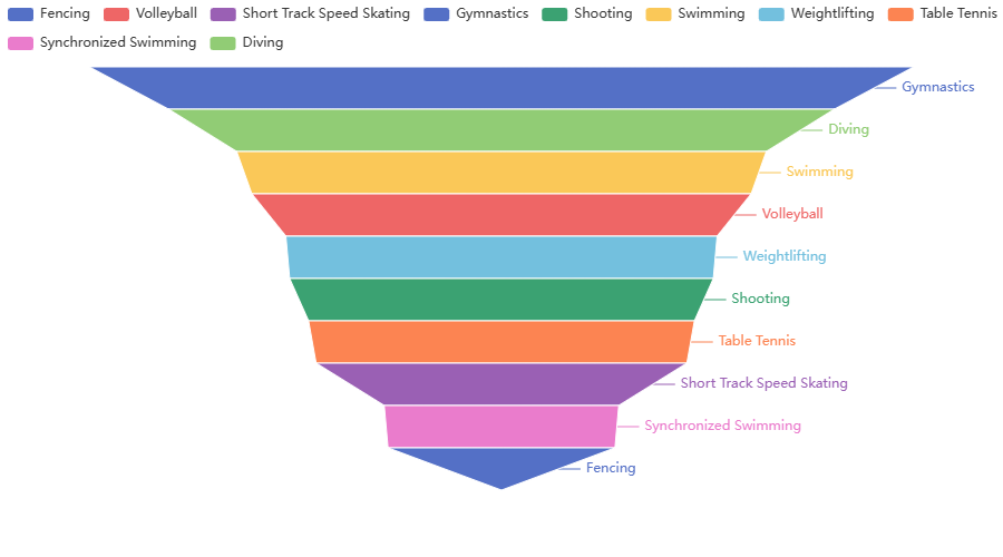 #漏斗图 #中国最强项目 adv_data=data[data["Team"]=="China"].groupby(by="Sport")["Medal"].count().to_frame() adv_data=adv_data.sort_values(by="Medal",ascending=False)[0:10] sport_name=[str(i) for i in adv_data.index] sports=[int(j)for j in adv_data.values] sha = (Funnel() .add("", [z for z in zip(sport_name,sports)]) ) sha.render_notebook()