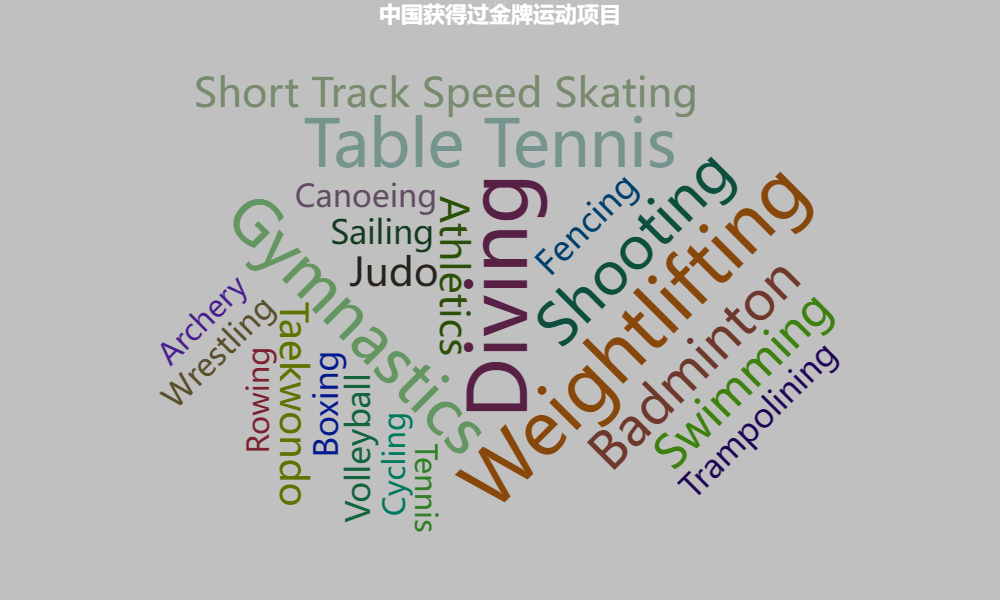 #词云图 #中国优势项目 CN_data = data[data.region == 'China'] CN_data.head() CN_events = CN_data[CN_data.Medal == 'Gold'].groupby(['Year', 'Sport'])['Event'].nunique().reset_index() CN_events = CN_events.groupby(['Sport'])['Event'].sum().reset_index() CN_events.columns = ['Sport', 'Nums'] data_pair = [(row['Sport'], row['Nums']) for _, row in CN_events.iterrows()] cy = (WordCloud(init_opts=opts.InitOpts(bg_color='silver', width='1000px', height='600px')) .add("", data_pair, word_size_range=[30, 80]) .set_global_opts(title_opts=opts.TitleOpts(title="中国获得过金牌运动项目", pos_left="center", title_textstyle_opts=opts.TextStyleOpts(color="white", font_size=22))) ) cy.render_notebook()