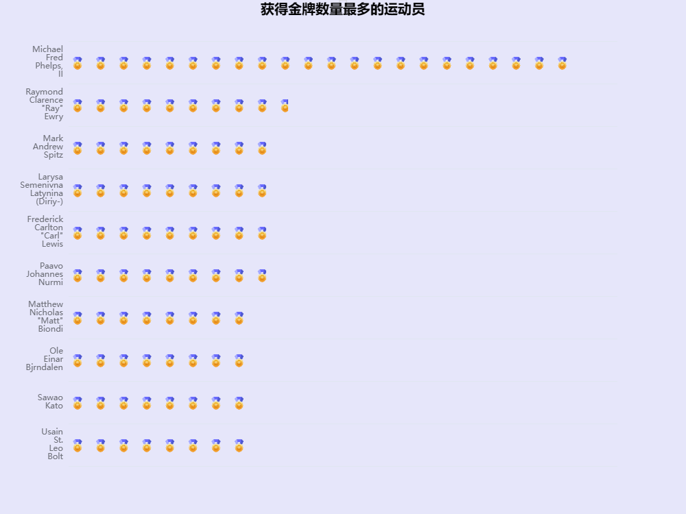 通过上面运行结果可知,在1896年--2016年中获得金牌最多的运动员为Michael Fred Phelps,他在自己的奥运生涯中共获得了23金3银2铜的成绩。
