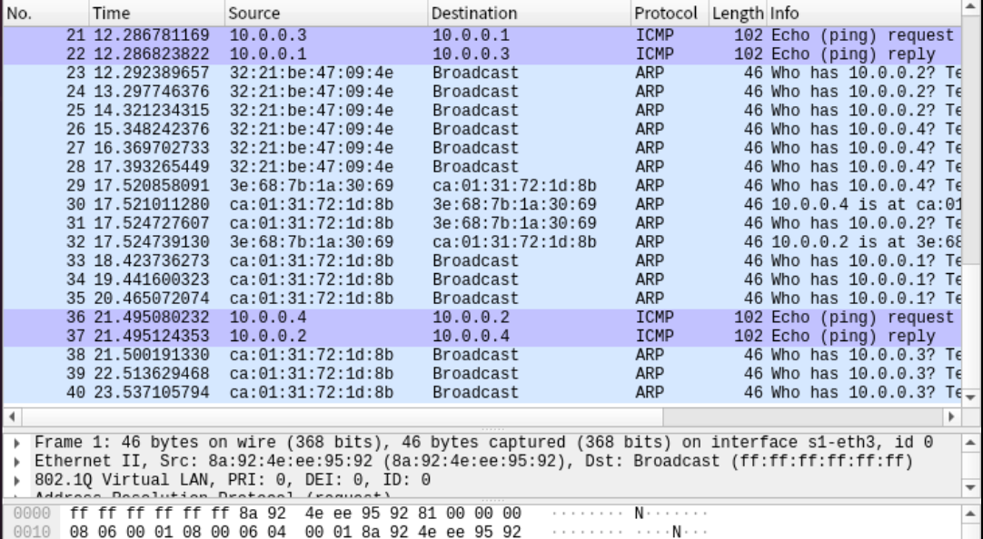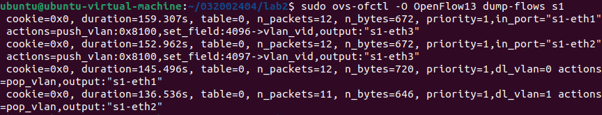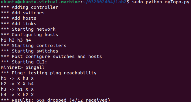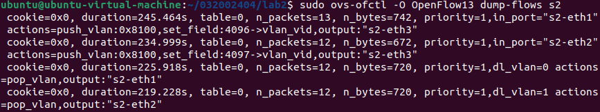 /home/用户名/学号/lab2/目录下开启Mininet CLI并执行pingall命令的截图、上述目录下查看OVS流表的命令结果截图,wireshark抓包截图