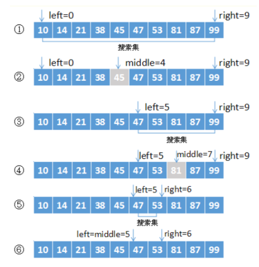 - 不断将有序数据集对半分割,并检查每个分区的中间元素