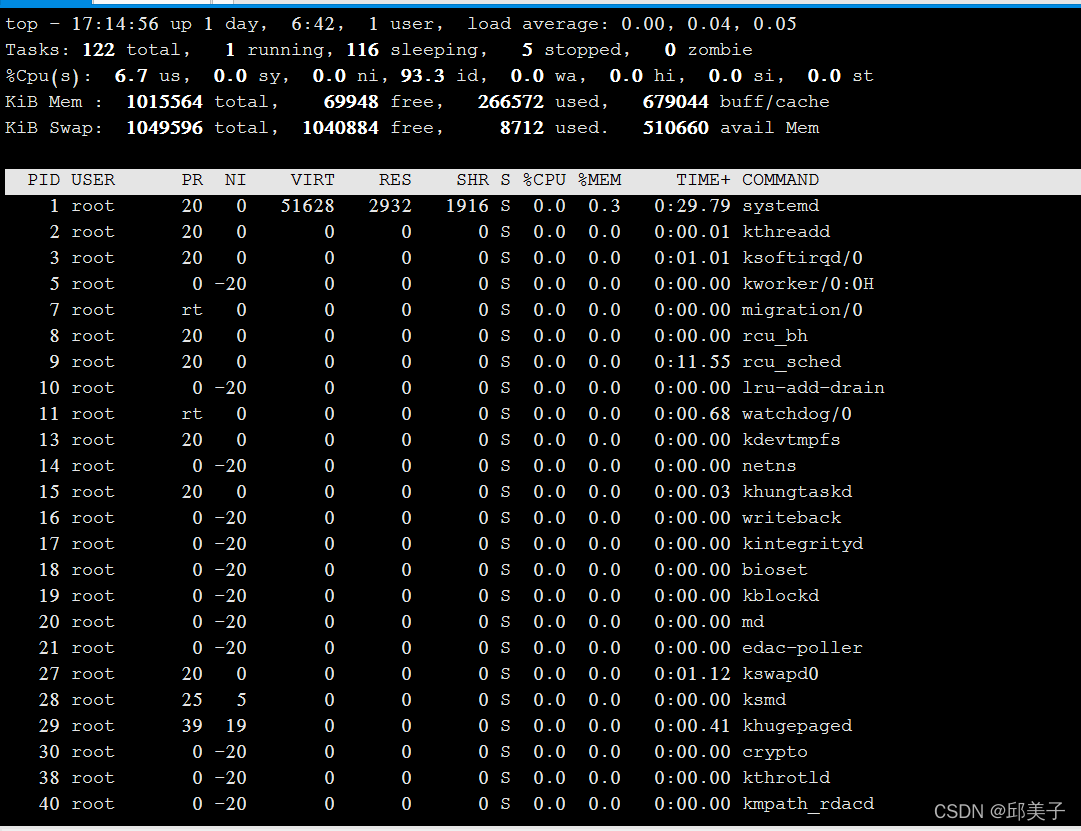 CPU信息:us,用户占用;sy,内核占用;ni,优先级调度占用;id,空闲CPU;wa,I/O等待占用;hi,硬件中断占用;si,软件中断占用;st,虚拟化占用。了解空闲的CPU百分比,主要看%id部分。