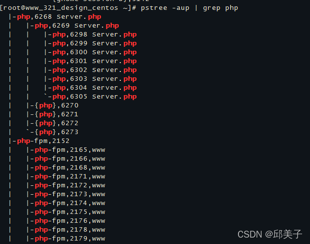 可以带上|grep 查询特定进程。例如 pstree -aup | grep php