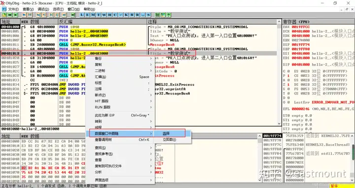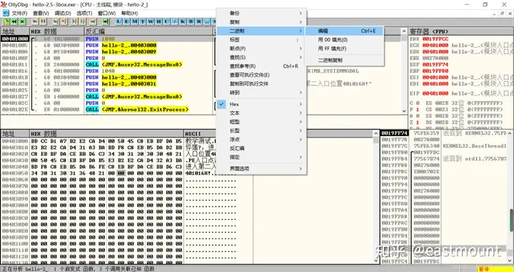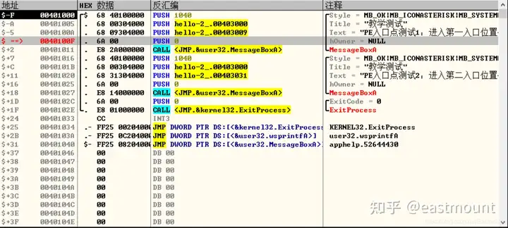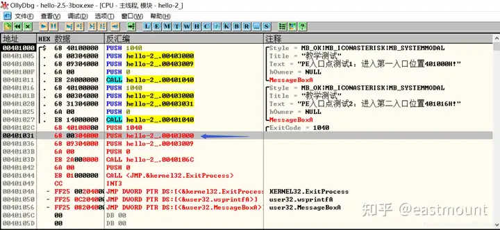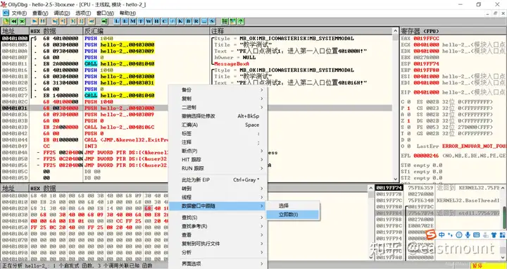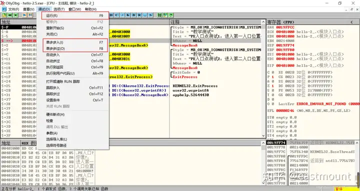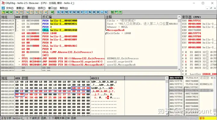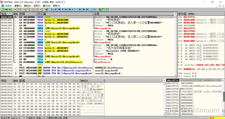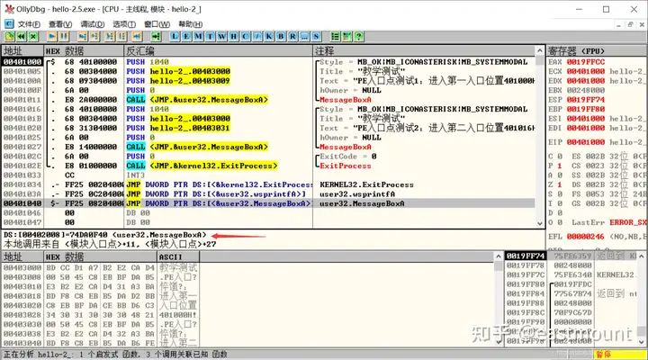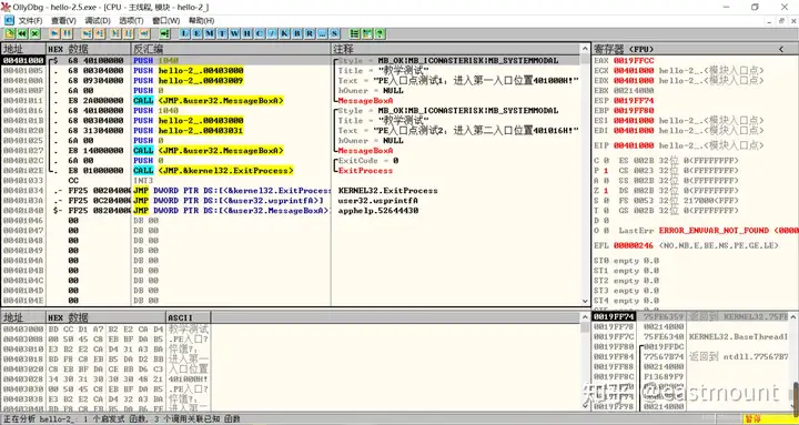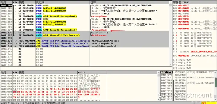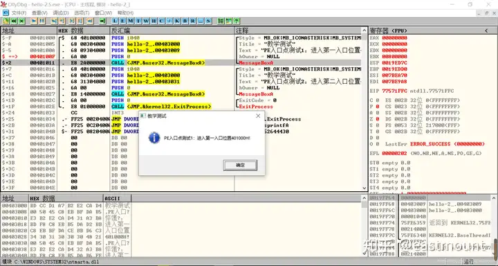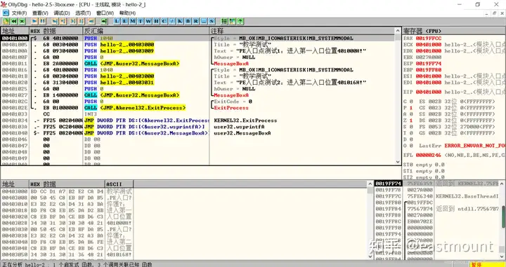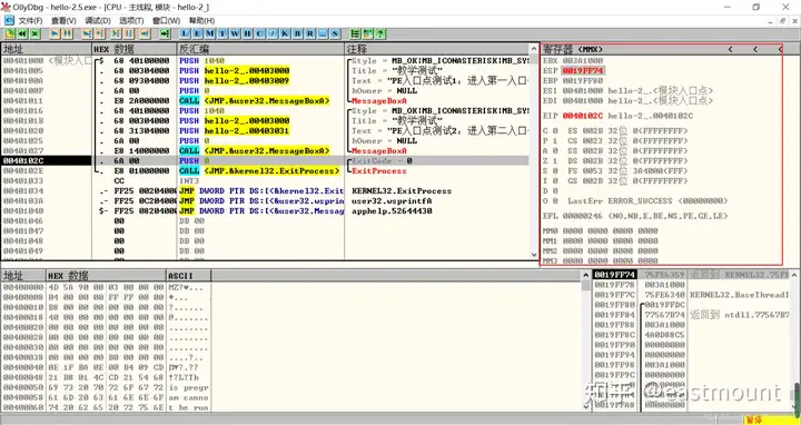 第三步,用OD打开hello-2.5.exe,查看MessageBoxA,两个值并不一致。