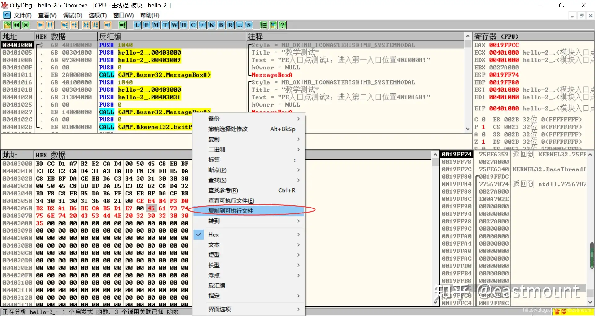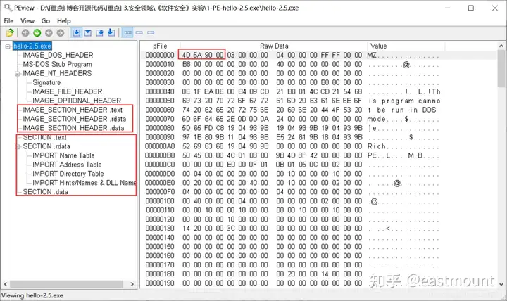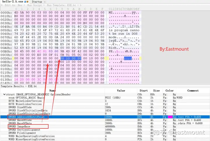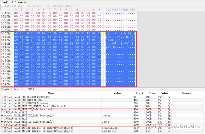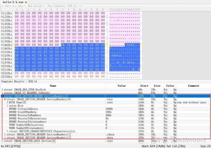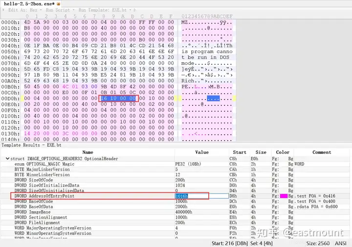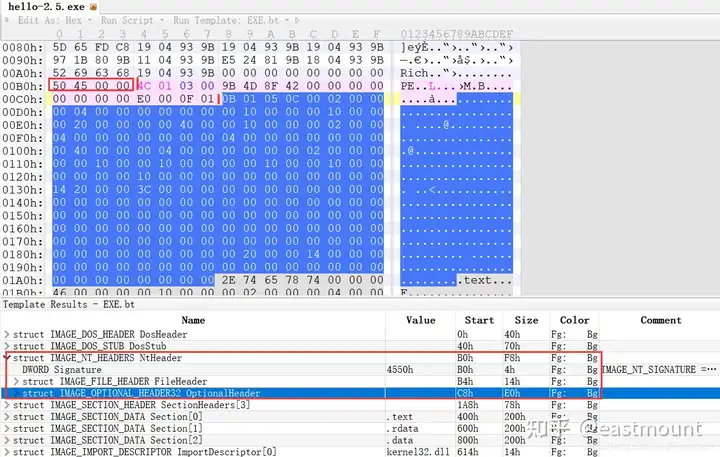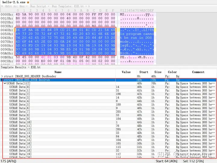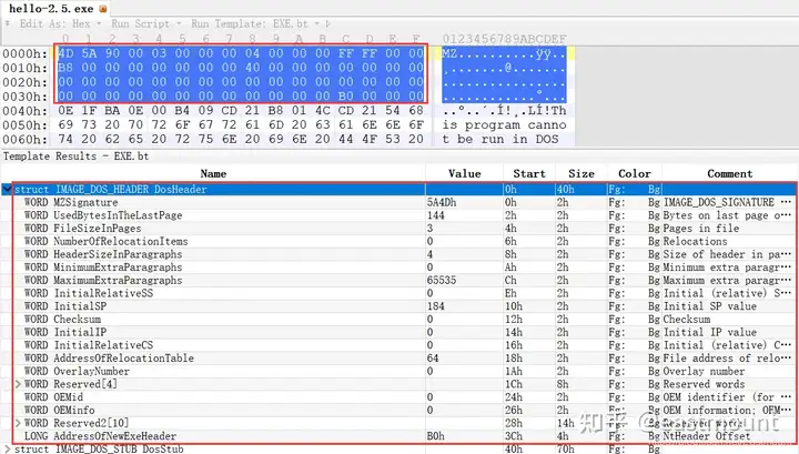 - 使用010Editor观察PE文件例子程序hello-2.5.exe的16进制数据