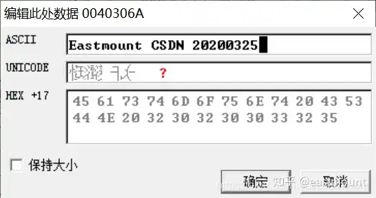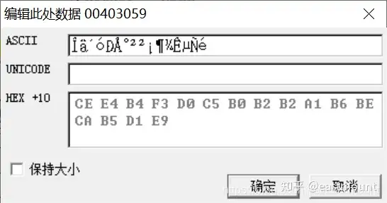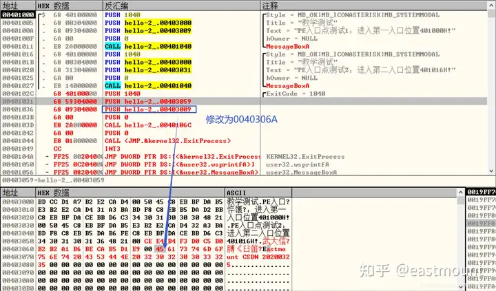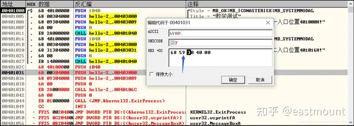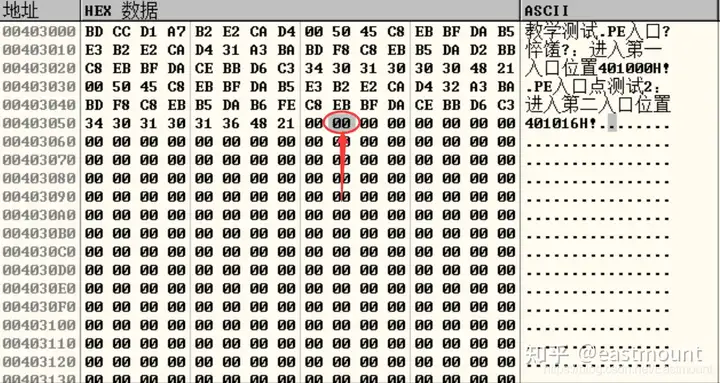 注意,从下图所示的位置开始修改,地址为0040 3059,需要留一个00字符,表示截断符。同样,title和text之间也要用00隔开。