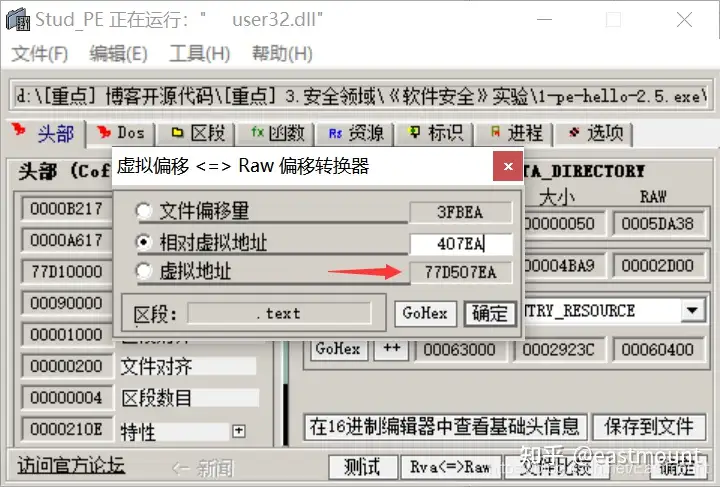 第二步,得到RVA为38D9后,用Stud_PE打开user32.dll,使用Raw与RVA转换功能,得其VA为77D507EA。