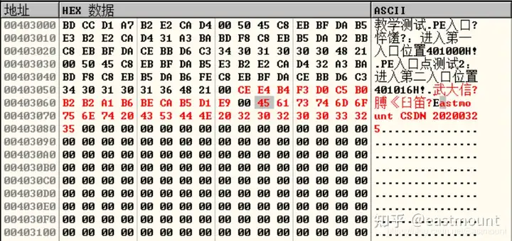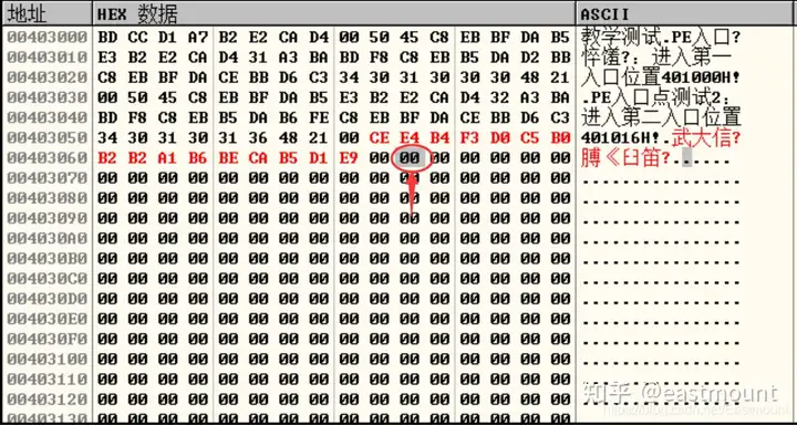 此时标题已经成功写入,接着空一个00,从下图所示位置接着写入正文内容,地址为0040 306A。