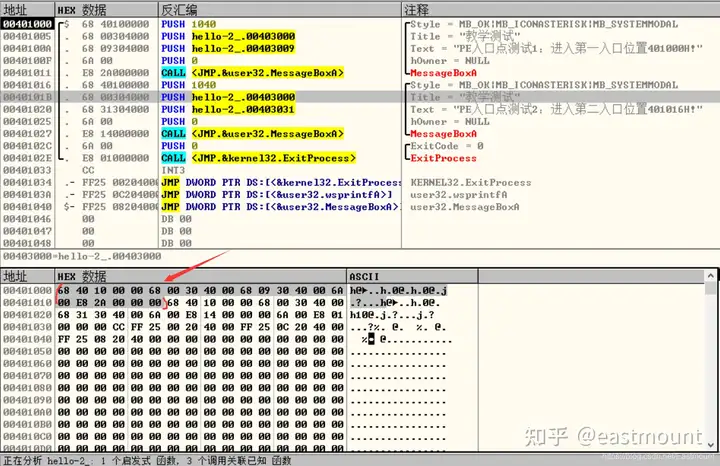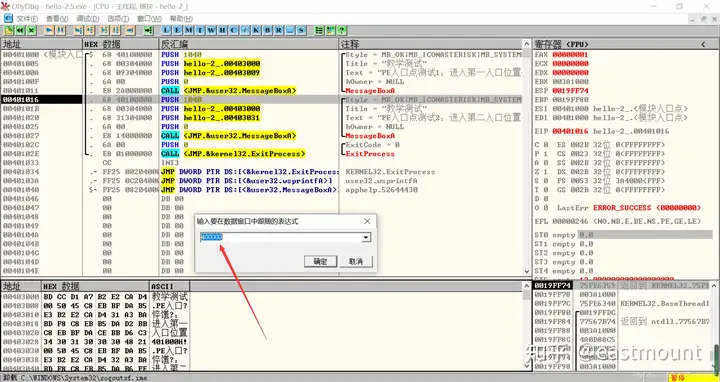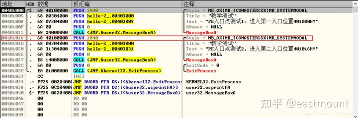 然后看到OD里,为第二个call做传入参数的push语句从401016开始,故我们将1000改为1016即可弹出第二个窗口。