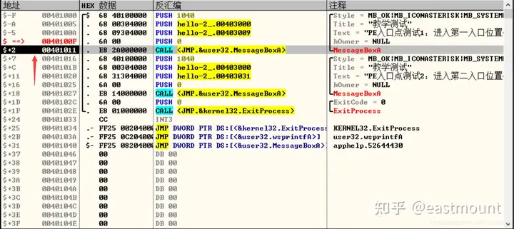- 修改.text段:添加MessageBoxA的函数调用