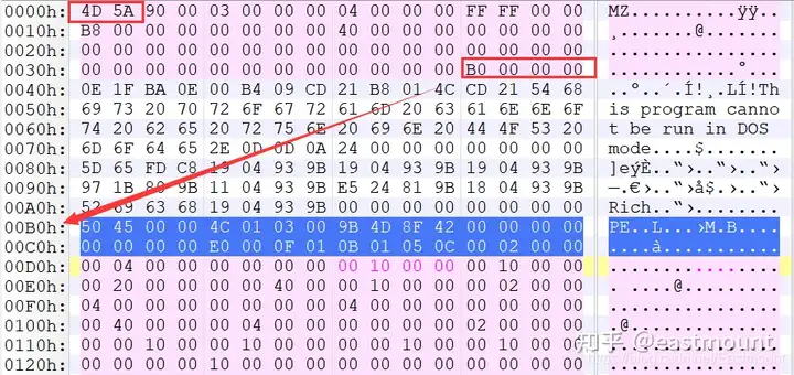 000000B0指向PE文件头开始位置。