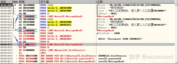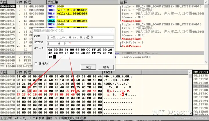 注意,三个对话框CALL对应的E8值需要以00401056(user32.MessageBoxA)为基址。