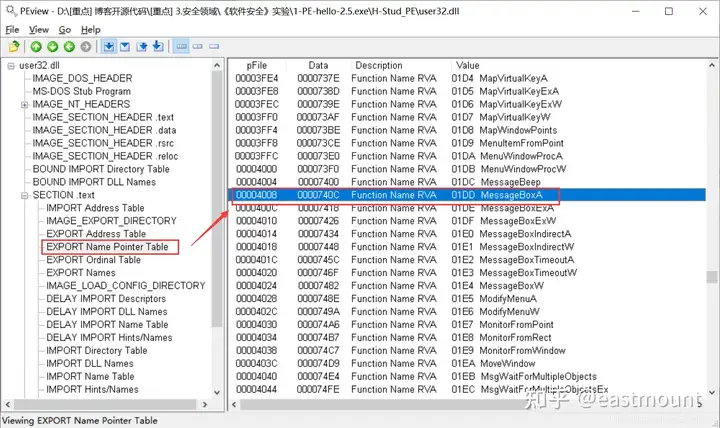 第一步,使用PEView打开user32.dll,查找MessageBoxA的RVA。