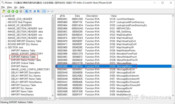 Address Table中01DD项的Data为407EA,也即MessageBoxA的RVA(相对虚拟地址)。
