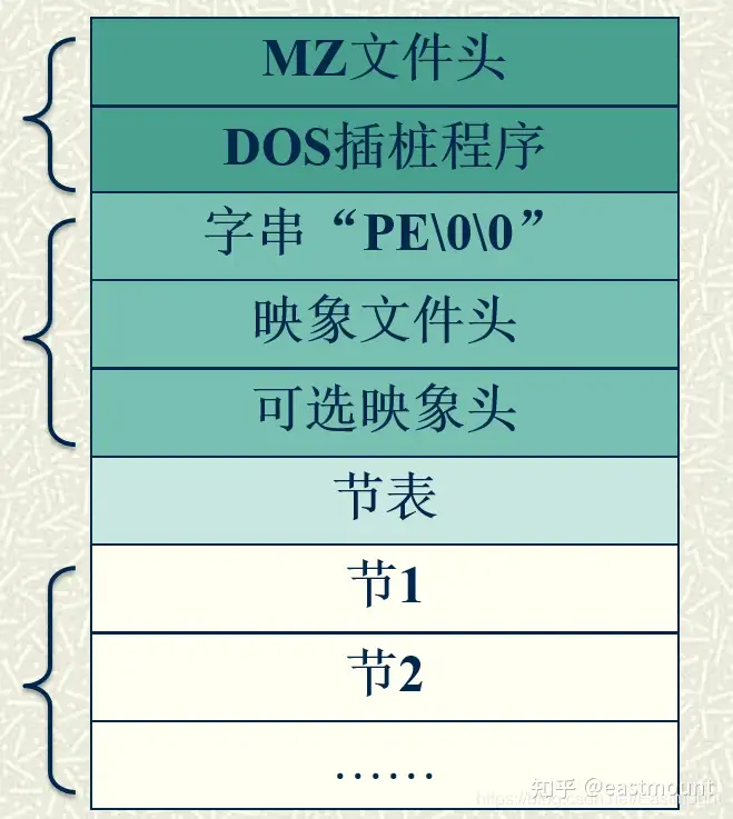 MZ头部+DOS stub+PE文件头+可选文件头+节表+节