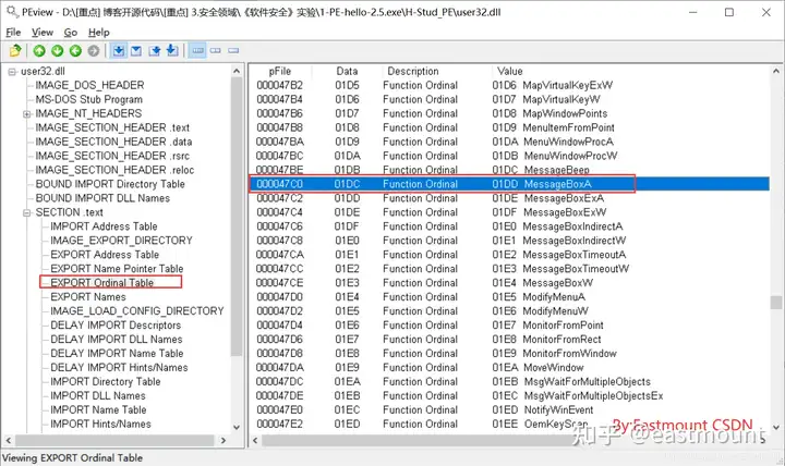找到系统System32目录下的user32.dll文件并打开,在AddressOfNames数组(Name Pointer Table)中找到MessageBoxA字符串,其数组序号为01DD。