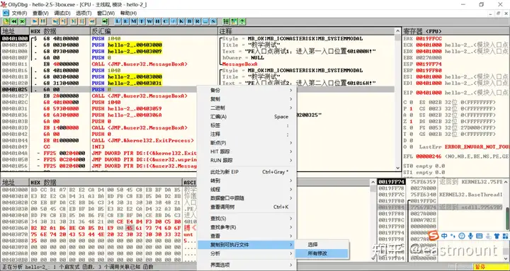 实验内容是手工修改hello-2.5.exe程序,使得其可以弹出第三个对话框(提示框标题为“武汉大学信安病毒实验”,内容为:你的姓名+日期)。基本思路为: