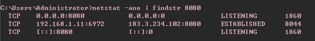 再次查看的时候,pid为1860端口为8080的java.exe已经被终止