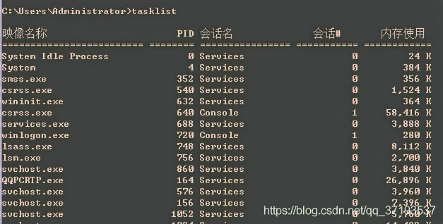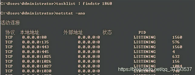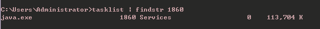 tasklist相当于展示出所有的启动的任务。如下。如果在上面步骤之后,我们得到的PID为1860,那么我们就可以输入命令【tasklist|findstr 1860】,在第一行显示的名字就是程序名,这样我们就明白是那个程序占用的端口。