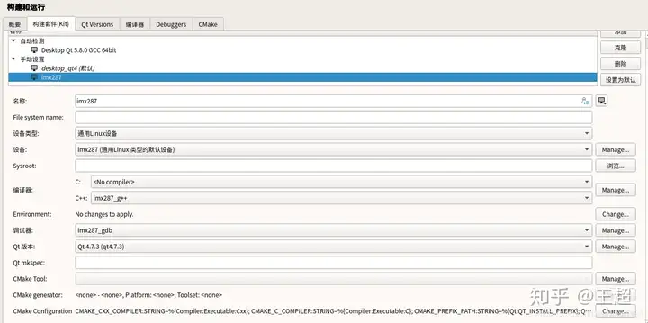 打开工具->选项->构建和运行菜单,添加嵌入式Qt的构建套件,默认桌面环境下的Qt4构建套件已经安装好了。我们只需要设置一下嵌入式环境下的Qt4构建套件