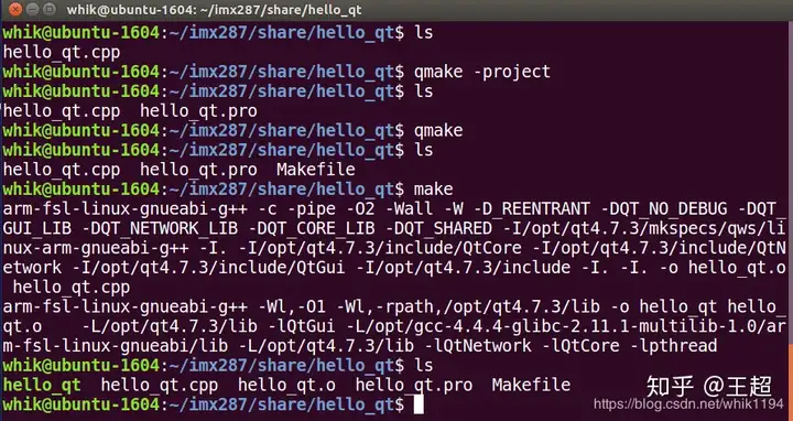 程序很简单,就是新建了个标签,文本内容是"hello qt",然后让这个标签show出来。下面开始编译,生成可执行文件: