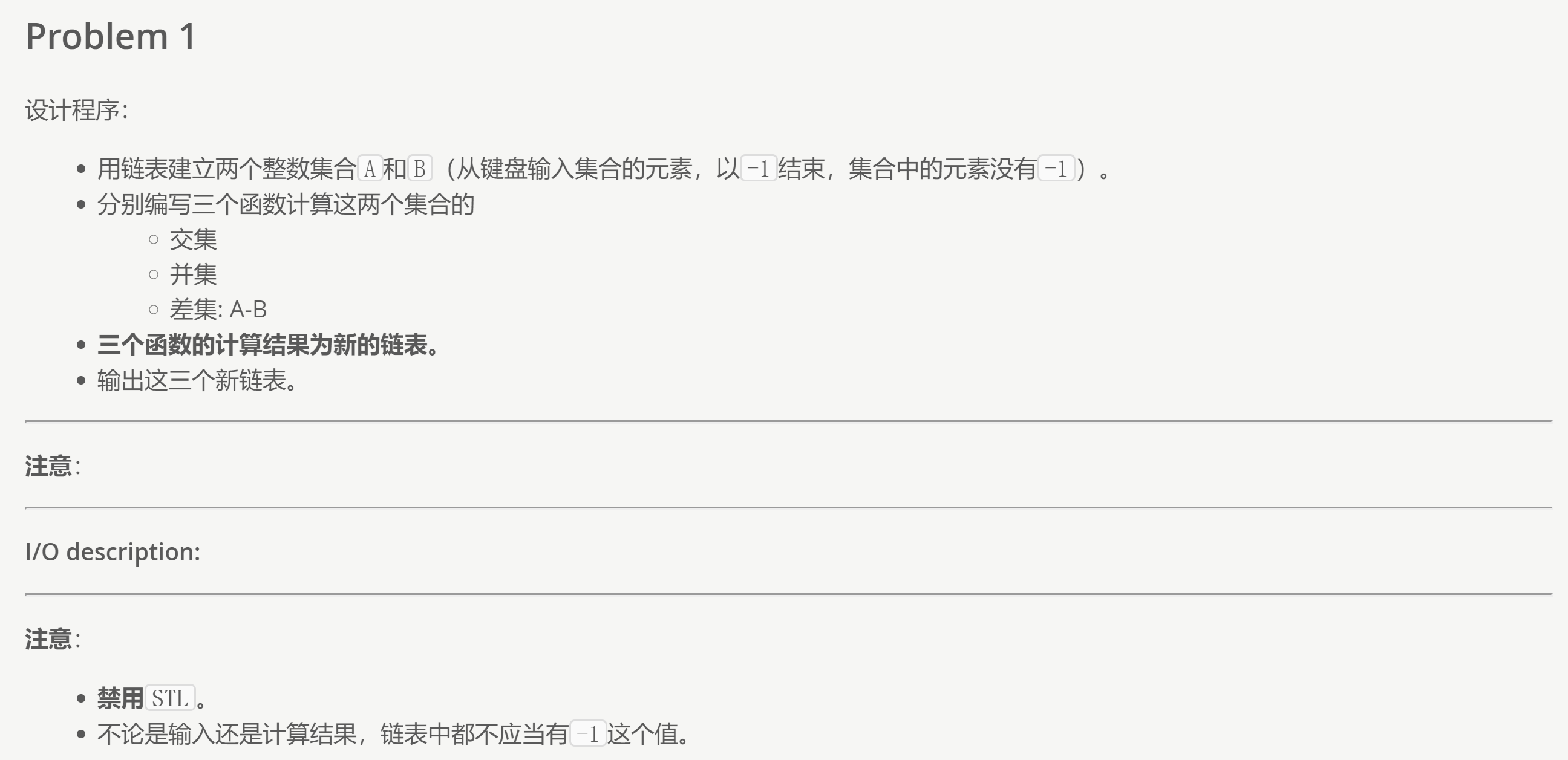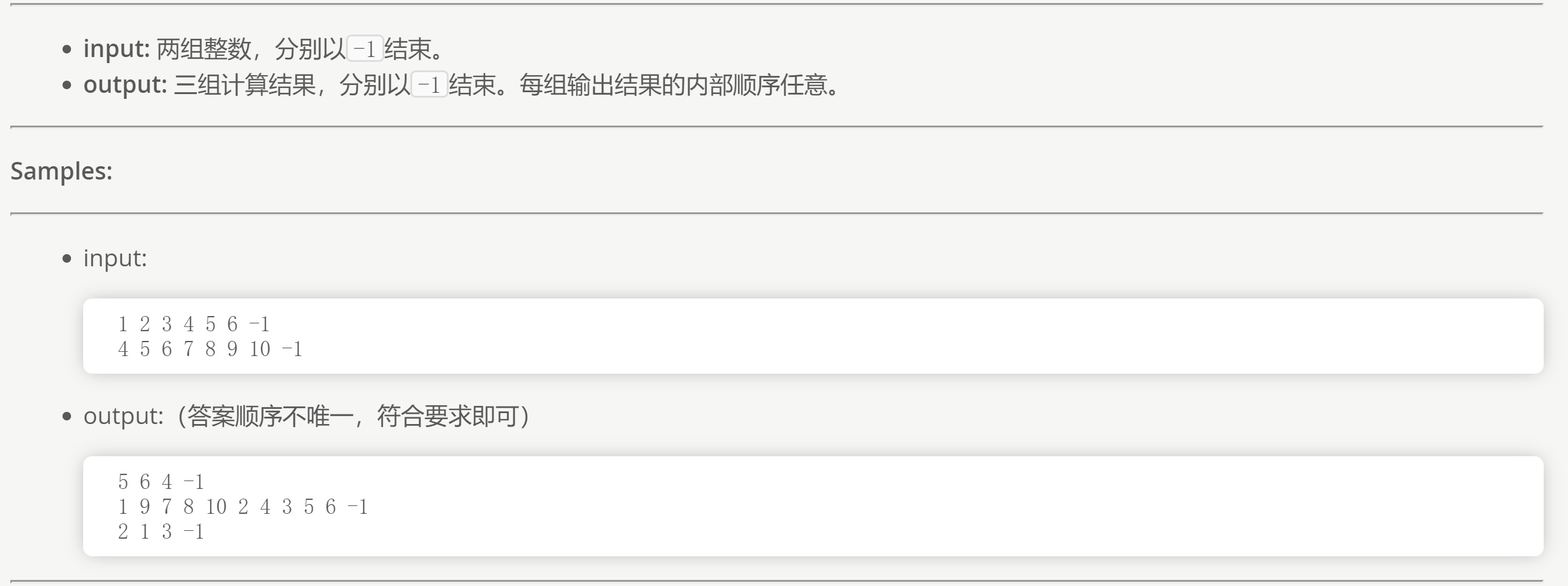 #include<stdio.h> #include<stdlib.h> struct node//链表结构体 { int data;//数据域 struct node* next;//指向下一个结构体的指针 }; node* create(int data)//新建链表项(新结构体) { node* newNode = (node*)malloc(sizeof(node));//给这个结构体开空间 newNode->data = data;//保存数据 newNode->next = NULL;//指针为空 return newNode;//返回新建的结构体 } int main() { struct node *p,*q,*t,*h;//定义几个临时变量,会用到 int tmp; //输入集合A scanf("%d", &tmp); struct node* head_a = create(tmp);//头节点 p = head_a;//p是临时变量 while (scanf("%d", &tmp) && tmp != -1)//输入数字,且当tmp=-1的时候结束 { struct node* a = create(tmp);//给链表A新建节点 p->next = a;//上一个节点的指针指向现在这个 p = a;//临时变量变成现在这个 } //输入集合A scanf("%d", &tmp); struct node* head_b = create(tmp);//头节点 p = head_b;//p是临时变量 while (scanf("%d", &tmp) && tmp != -1)//输入数字,且当tmp=-1的时候结束 { struct node* b = create(tmp);//给链表A新建节点 p->next = b;//上一个节点的指针指向现在这个 p = b;//临时变量变成现在这个 } struct node* head_jiao = create(-1);//定义交集的头结点 struct node* head_bing = create(-1);//定义并集的头结点 struct node* head_cha = create(-1);//定义差集的头结点 /* 交集思路: 遍历A,对A的每个元素 ,都与B中的元素进行一一对比 类似于for循环中的 for(int i=0;i<n;i++) { for(int j=0;j<m;j++) { 比较a和b } } */ p=head_a;//p是临时变量,从A的头开始 t=head_jiao;//t是临时变量,用来存交集的链表 while(p!=NULL)//链表A非空 ,遍历A链表 { q=head_b;//q是临时变量 ,从B的头开始 while(q!=NULL)//链表B非空 ,遍历B链表 { if(q->data==p->data)//B元素=A元素 { //如果a和b中有相同元素,则存进交集链表中 //以下操作与输入A,B集合同原理 struct node* jiao = create(p->data); t->next = jiao; t = jiao; break;//因为找到了,所以break掉,去比较A的下一个元素 } q=q->next;//链表B的当前位置后移(q->next是下一个元素,让q=下一个元素 } p=p->next;//链表A的当前位置后移(p->next是下一个元素,让p=下一个元素 } /* 输出交集 因为head_jiao->data头节点的数据域中存的是-1(见上文定义交集头结点 故从head_jiao的下一个开始 */ t=head_jiao->next; while(t!=NULL)//遍历交集链表 { printf("%d ",t->data);//输出元素,记得加空格 t=t->next;//后移 } //Attention:这个-1不应该被放在链表中 printf("-1\n");//最后的元素以-1结尾,记得加换行 /* 并集思路: 先复制A的所有元素在并集bing里面 然后遍历B,将B的每一个元素都与bing中元素比较 若比较到最后都不一样,则当前元素不在bing中 将这个元素添加进bing的末尾 */ p=head_a;//p是临时变量,从A的头开始 t=head_bing;//t是临时变量,用来存并集的链表 while(p!=NULL)//遍历链表A { //以下操作与输入A,B集合同理,使用链表A的数据 struct node* bing = create(p->data); t->next = bing; t = bing; p=p->next;//链表A的当前位置后移(p->next是下一个元素,让p=下一个元素 } q=head_b;//q是临时变量,从B的头开始 while(q!=NULL)//遍历链表B { h=head_bing;//h是临时变量,读取并集的链表 int flag=0;//用flag来记录是否有相同元素 while(h!=NULL)//遍历并集 { if(h->data==q->data)//存在相同元素 { flag=1; break; } h=h->next;//后移 } if(!flag)//如果不存在相同元素 { //以下操作与输入A,B集合同理,使用链表B的当前元素数据 //t还是上面复制的时候定义的那个,继续相同操作 struct node* bing = create(q->data); t->next = bing; t = bing; } q=q->next;//后移 } /* 输出并集 因为head_bing->data头节点的数据域中存的是-1(见上文定义并集头结点 故从head_bing的下一个开始 */ t=head_bing->next; while(t!=NULL)//遍历并集链表 { printf("%d ",t->data);//输出元素,记得加空格 t=t->next;//后移 } //Attention:这个-1不应该被放在链表中 printf("-1\n");//最后的元素以-1结尾,记得加换行 /* 差集思路: 同并集,先复制链表A在链表cha里面 再遍历链表bing,如果遇到元素在链表A中,则删除链表节点 */ p=head_a;//p是临时变量,从A的头开始 t=head_cha;//t是临时变量,用来存差集的链表 while(p!=NULL)//遍历链表A { //以下操作与输入A,B集合同理,使用链表A的数据 struct node* cha = create(p->data); t->next = cha; t = cha; p=p->next;//链表A的当前位置后移(p->next是下一个元素,让p=下一个元素 } q=head_jiao;//q是临时变量,从jiao的头开始 while(q!=NULL)//遍历链表jiao { h=head_cha;//h是临时变量,从cha的第1个开始 t=head_cha->next;//t是临时变量,从cha的第2个开始 while(t!=NULL)//遍历cha差集,寻找当前数,然后把它删了 { if(t->data==q->data)//如果相等,删除 { h->next=t->next;//跳过t指向下一个 break; } //如果没删除,后移 h=h->next; t=t->next; } q=q->next;//后移 } /* 输出差集 因为head_cha->data头节点的数据域中存的是-1(见上文定义并集头结点 故从head_cha的下一个开始 */ t=head_cha->next; while(t!=NULL)//遍历差集链表 { printf("%d ",t->data);//输出元素,记得加空格 t=t->next;//后移 } //Attention:这个-1不应该被放在链表中 printf("-1\n");//最后的元素以-1结尾,记得加换行 return 0; }