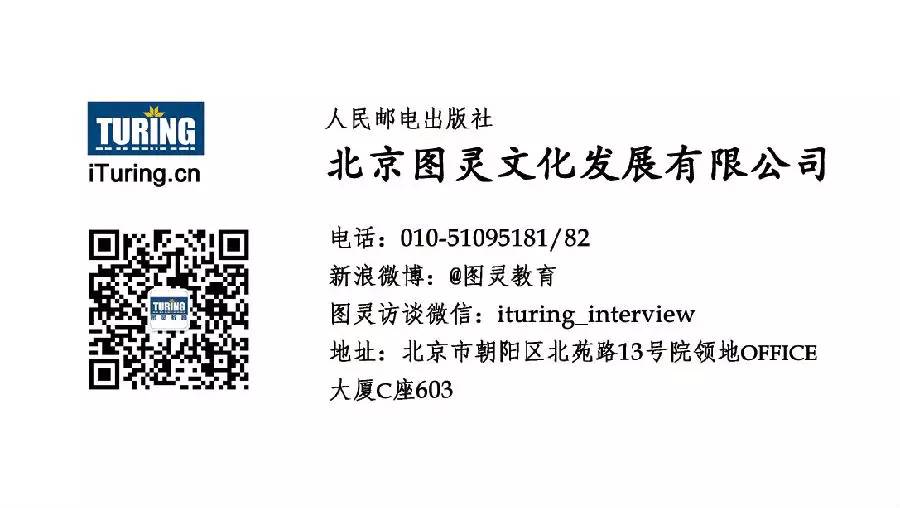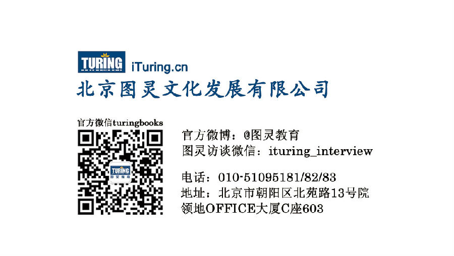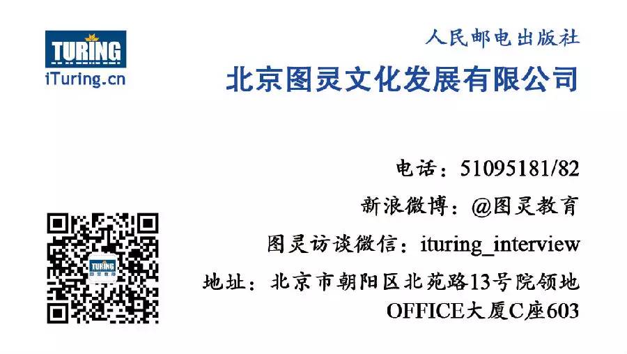 (2) 确定名片上须要加入的信息。这个事实上非常easy,要是个人名片的话,把自己的对外信息清晰简单地表达出来就好了。企业名片跟个人名片相差不大,以图灵君为例。名片上应该包含图灵教育的logo,公司名称、官方微信(turingbooks。由于图灵訪谈ituring_interview是个极具特色的微信。所以也放进来了)官方微博(@图灵教育)、公司的联系电话、公司的地址。