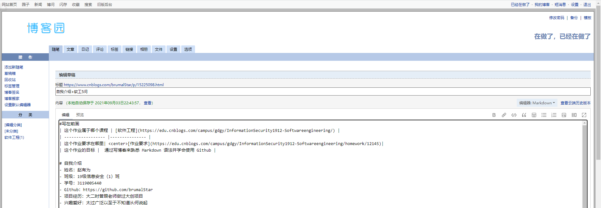 | 这个作业的目标 | 通过写博客来熟悉 Markdown 语法并学会使用 Github |