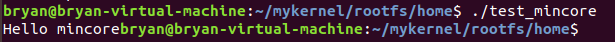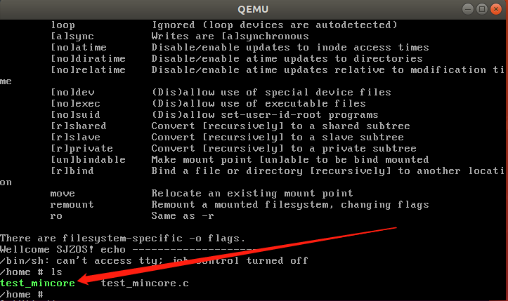 在qemu中 可以查看到系统中已经有了可执行程序test_mincore
