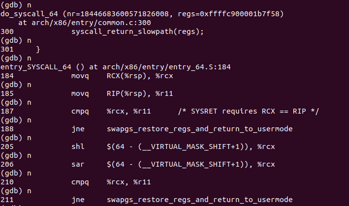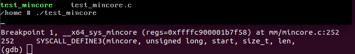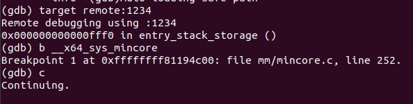 cd linux-5.4.34/ gdb vmlinux (gdb) target remote:1234 (gdb) b __x64_sys_mincore