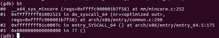在gdb中采用bt命令可以查看堆栈信息,l命令查看对应代码。由下图可知,mincore是通过syscall来进行的系统调用,entry_SYSCALL_64是系统调用的入口