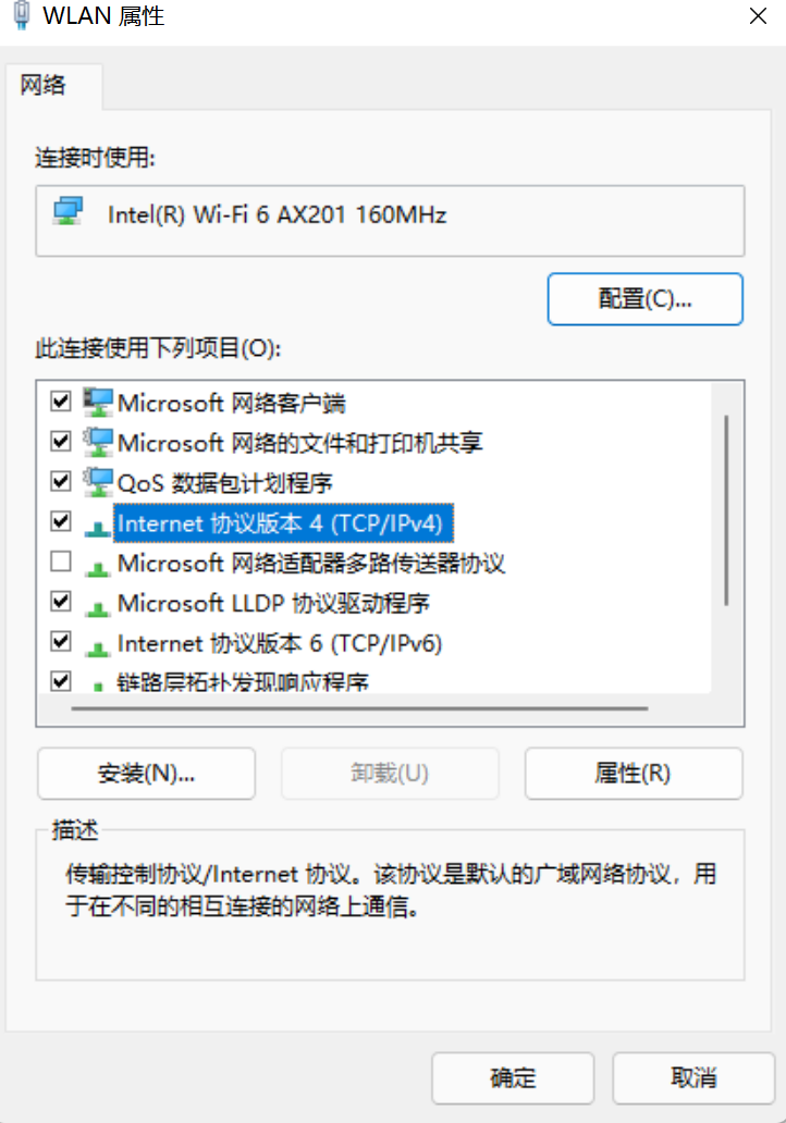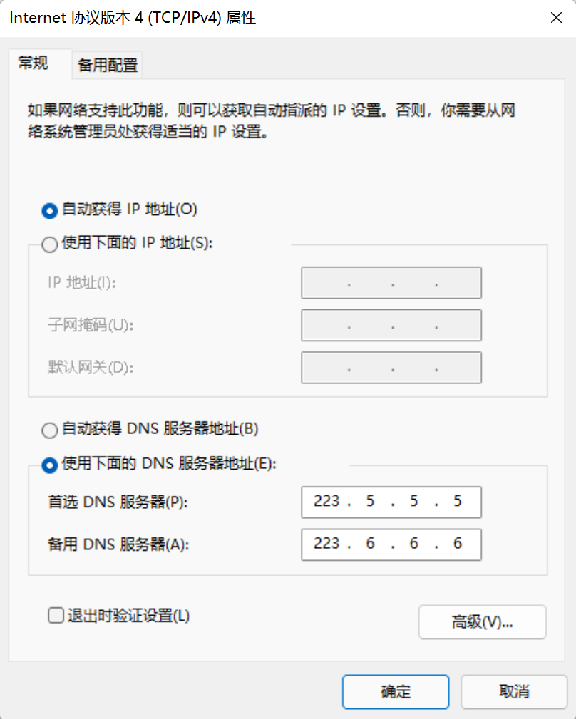 双击“Internet 协议版本 4(IPv4)”,进入 把IP地址改为自动获取,DNS服务器地址改为:223.5.5.5,备用DNS改为:223.6.6.6 确定保存配置。 此地址为:阿里公共DNS