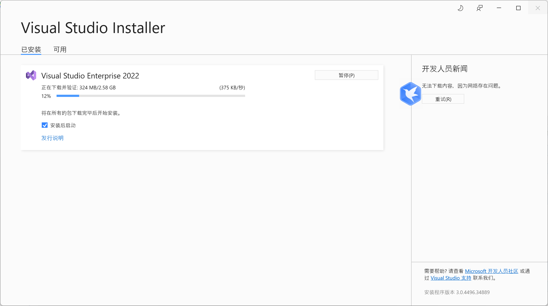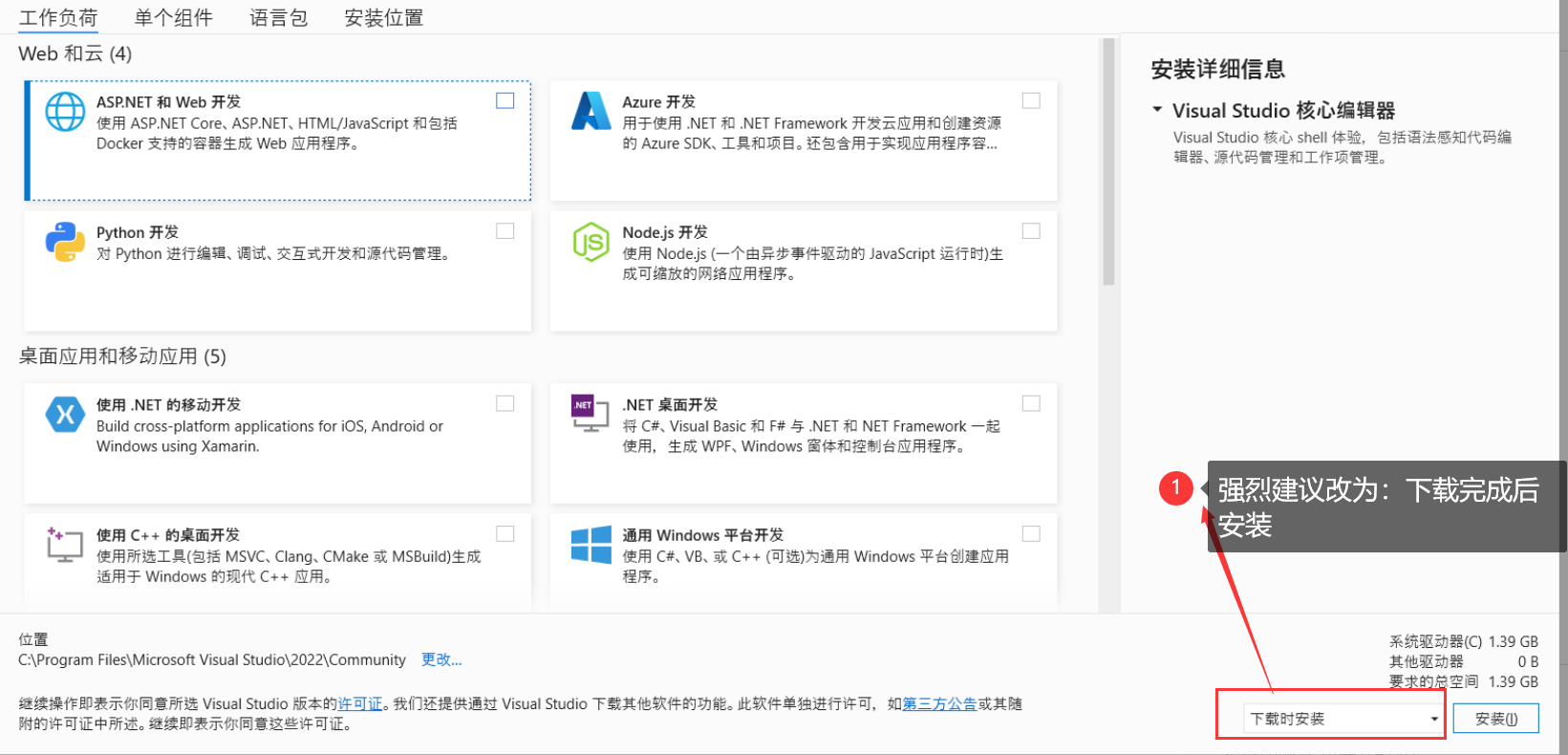 4.下载完成之后,启动“vs_enterprise”就会进入你熟悉的界面,下载选择模块的时刻强烈建议选择“下载完成后安装”