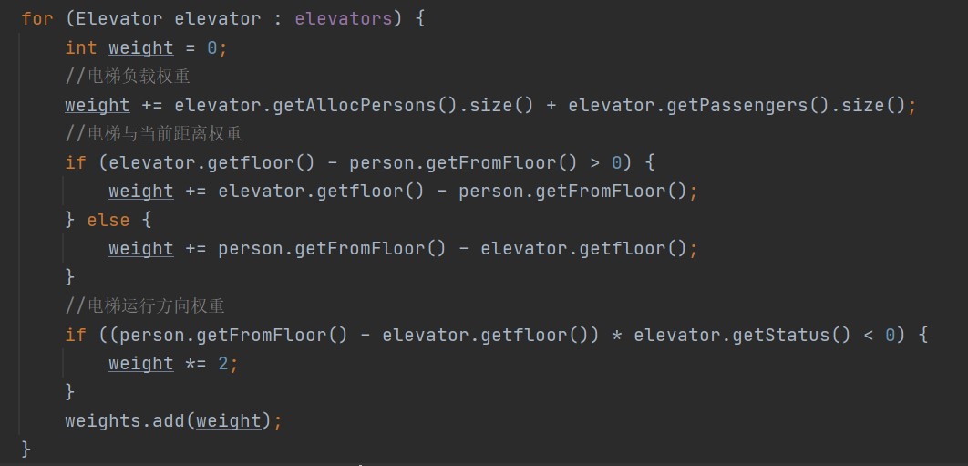 对权重的计算比较粗略,初始为0,加上当前电梯乘客数和与当前楼层的距离,如果运行方向相反,则权重翻倍。这样计算虽然粗略,但较为简单,适用于所有电梯,分配情况也不会太差。