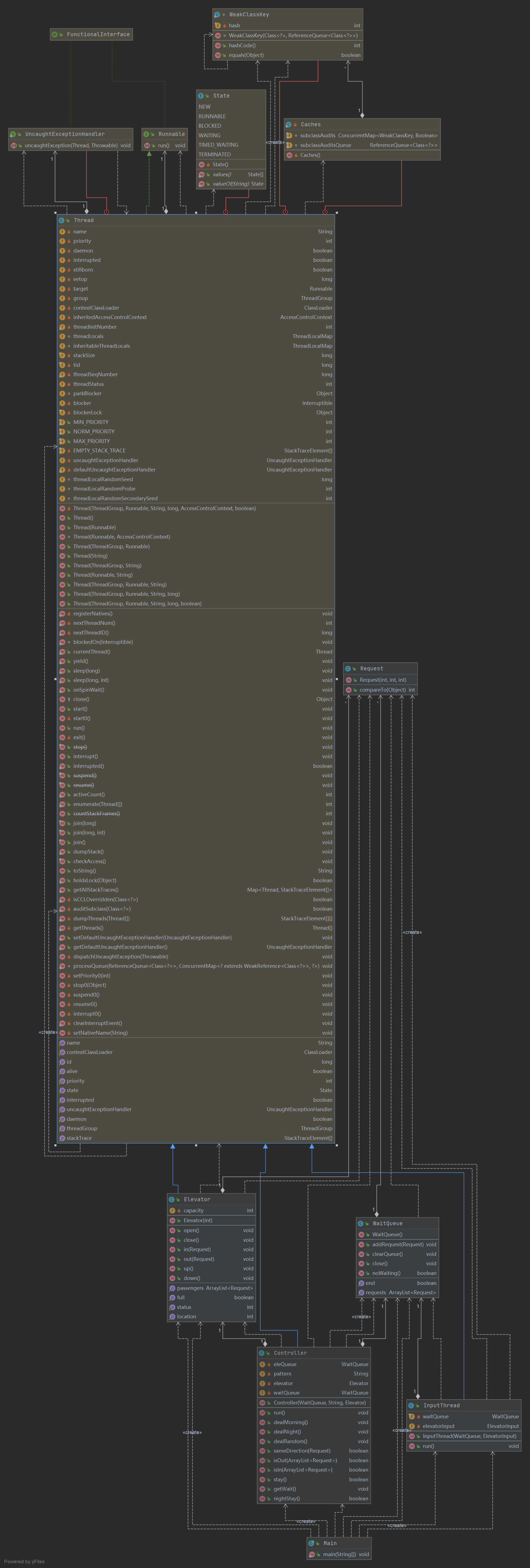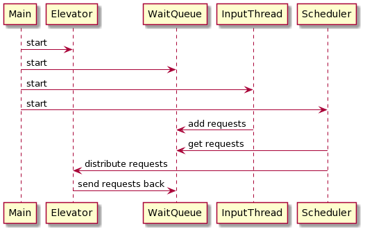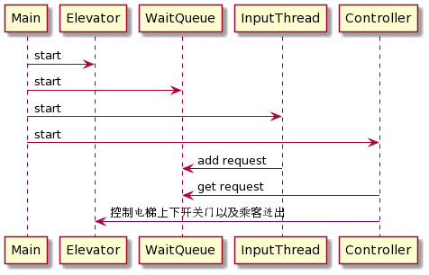 InputThread和Controller共享WaitQueue,读入请求和处理请求时需要加锁。因为第一次写的电梯完全由Controller控制,电梯只是一个能被操纵的机械装置,只有InputThread和Controller两个线程,所以进出电梯和电梯上下都由Controller控制。