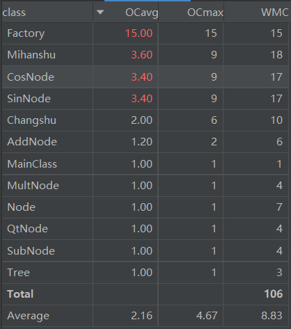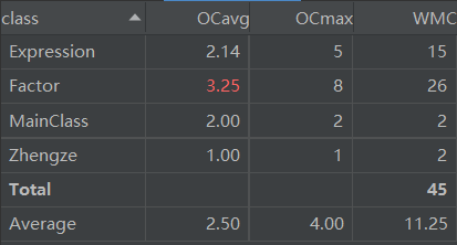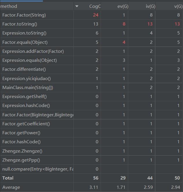 由上图可以看出,主要的问题出现在Factor类中,它的OCavg(the Average Cyclomatic Complexity)过高。主要是因为该类中的新建、求导、输出方法中判定结构过于复杂,有的是因为设计不良,有的则是因为涉及优化问题。