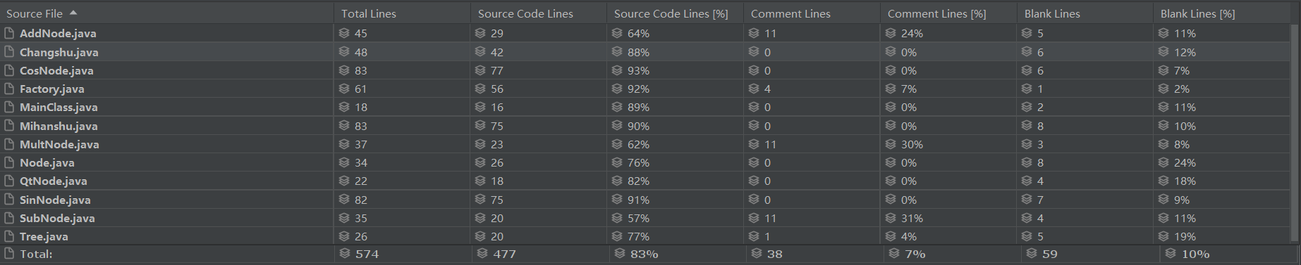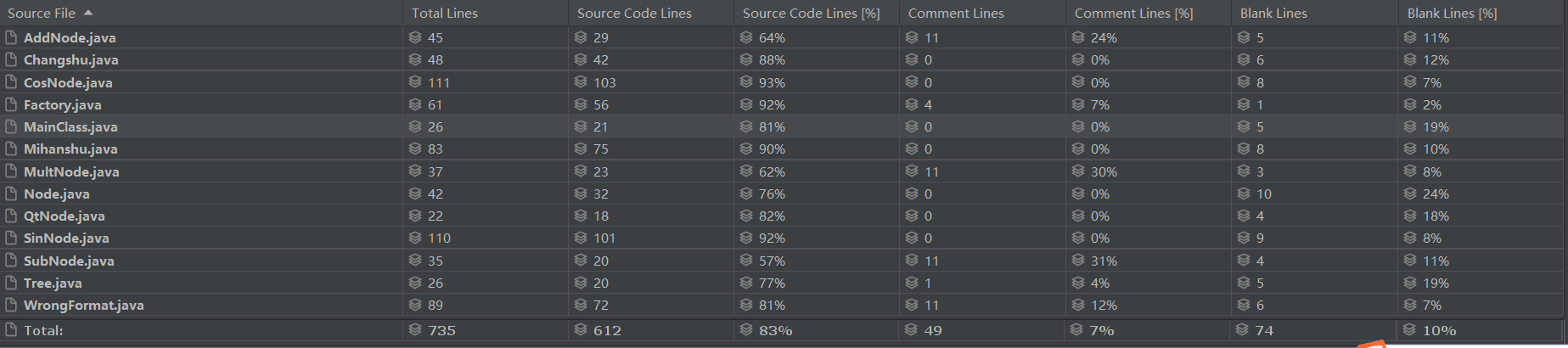 由上图可以看出,问题在于Factory,WrongFormat,CosNode,SinNode,Mihanshu这5个类上。分析一下的话,共性原因都是因为大量的判断结构,主要涉及构造、求导等等。